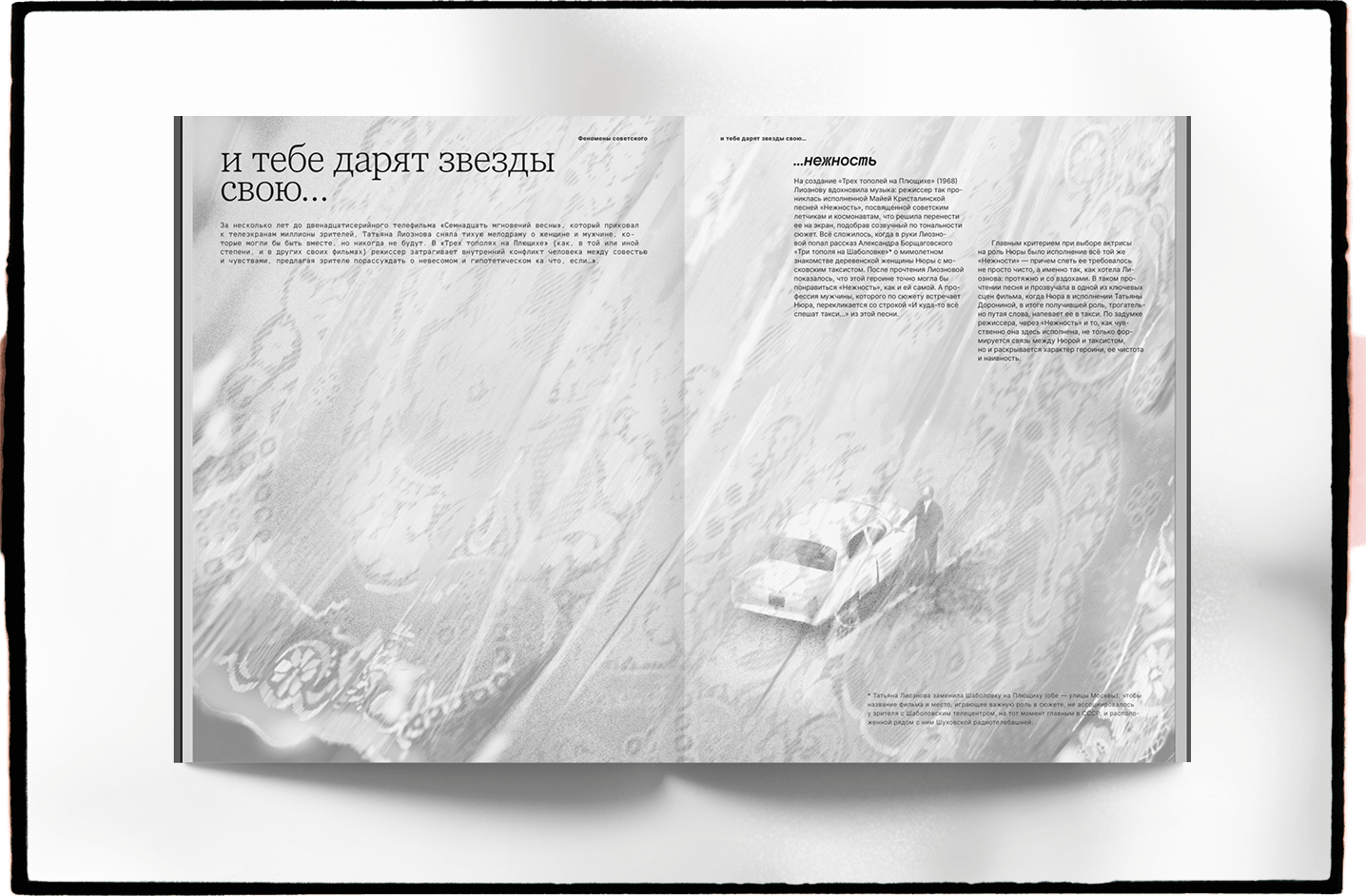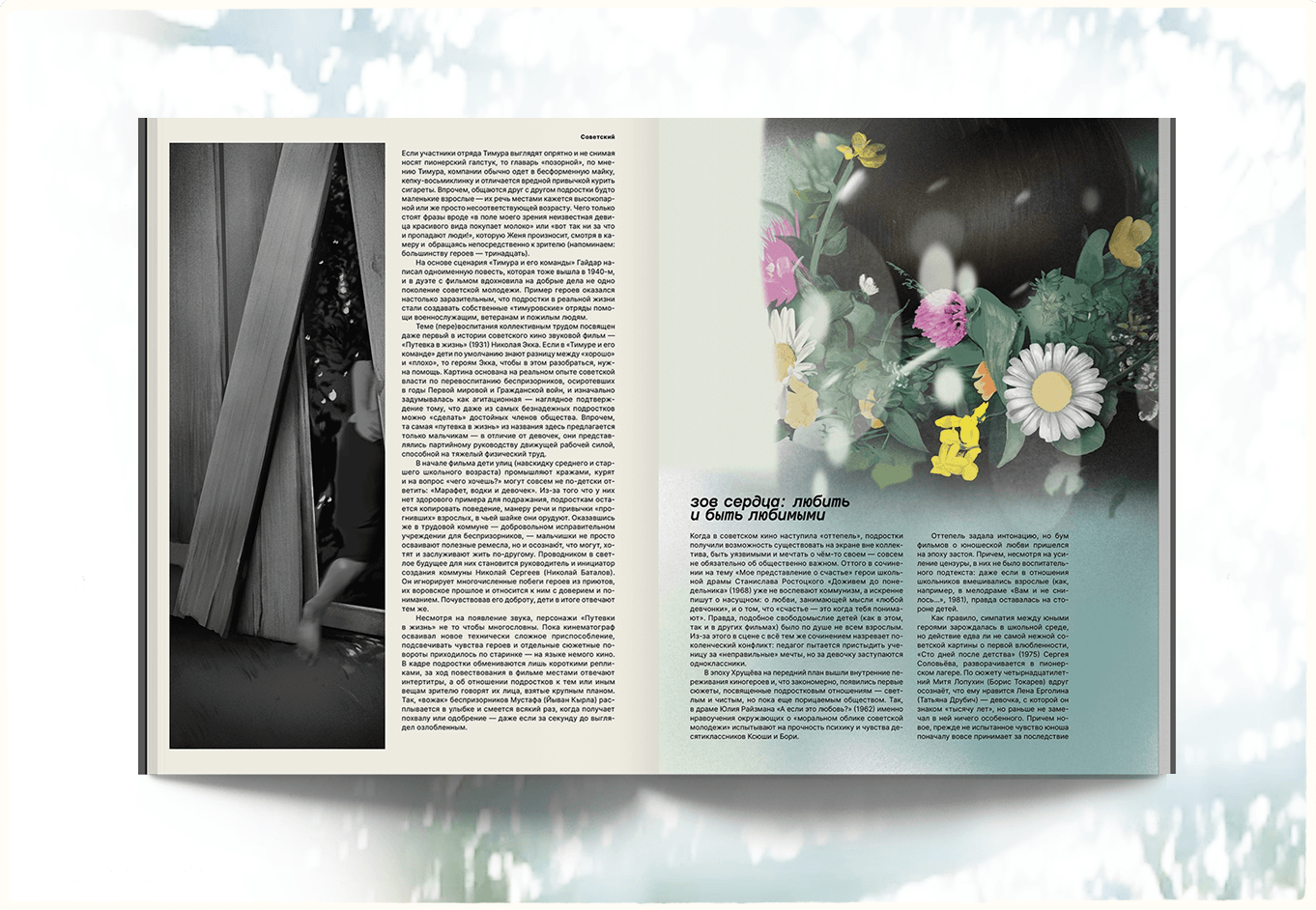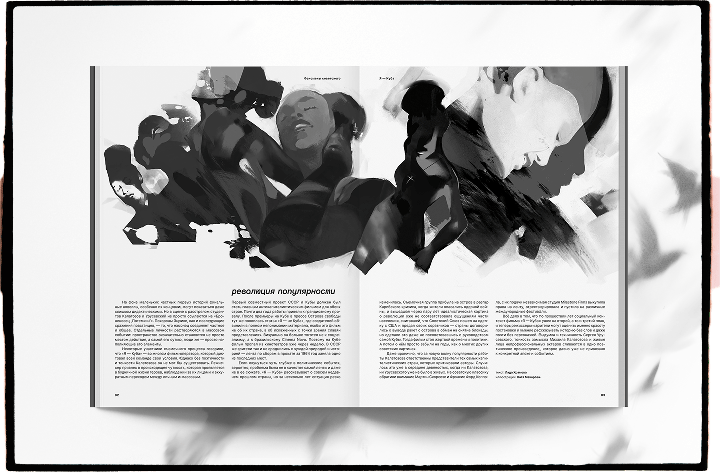 Внутри вас ждут большие материалы, посвященные отдельным фильмам: «Человек с киноаппаратом», «Мне двадцать лет», «Три тополя на Плющихе», «Я — Куба», «Облако-рай» и «Приключения Шерлока Холмса и доктора Ватсона». А также материалы о советской фантастике (от «Аэлиты» до «Сталкера» и «Города Зеро»), о взрослении советского человека (от «Тимура и его команды» до «Курьера»), об истернах («Свой среди чужих, чужой среди своих»), о любви, перестроечном кино и фильмах, которые больше всего нравились советскому зрителю.